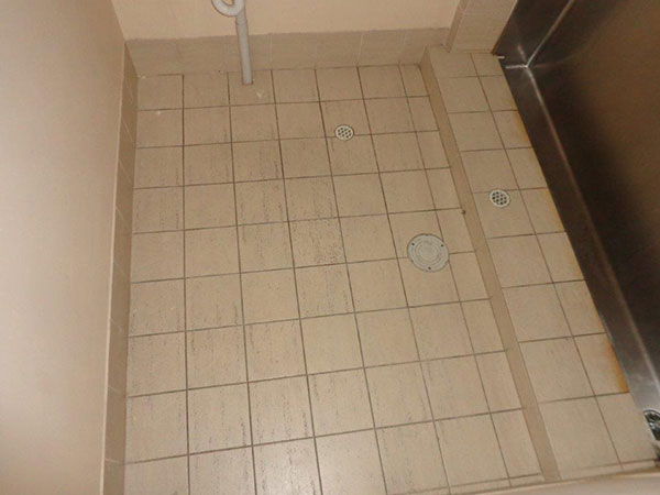 | Public restroom tiles & grout with dark, built up grime |